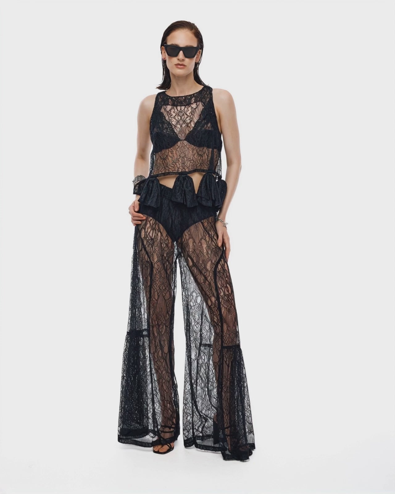 ブラック シルク ペザント パンツは、贅沢な 100% シルク サテンを使用しています。